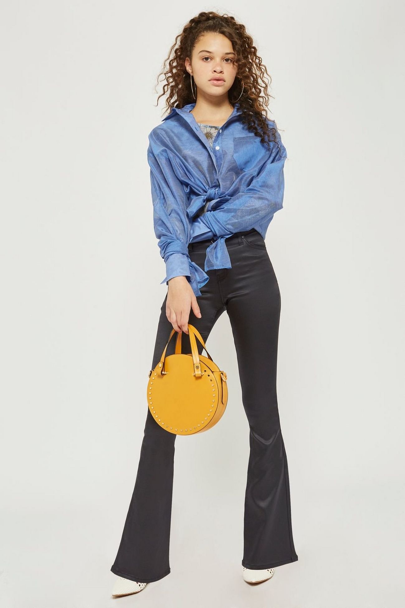 Topshop Jamie Flare Moto Black Sateen High Waisted Stretch Jeans